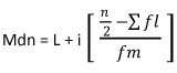 เมื่อ Mdn = มัธยฐาน ( Median ) L = ขีดจำกัดล่างที่แท้จริงของชั้นที่มีมัธยฐานอยู่ i = ความกว้างของอันตรภาคชั้น = ความถี่สะสมชั้นที่อยู่ก่อนชั้นที่มีมัธยฐานไปหาคะแนนน้อย = ความถี่ของคะแนนในชั้นที่มีมัธยฐาน คือตำแหน่งมัธยฐานEx. จากข้อมูลในตารางแจกแจงความถี่ จงหาค่ามัธยฐาน