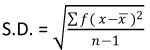หรือ  สูตรที่ 2 ![]() เมื่อ S.D. คือ ส่วนเบี่ยงเบนมาตรฐาน คือ ข้อมูล ( ตัวที่ 1,2,3...,n) คือ ค่าเฉลี่ยเลขคณิต คือ จำนวนข้อมูลทั้งหมดหมายเหตุ ในกรณีที่ เป็นทศนิยมทำให้เกิดความยุ่งยากในการคำนวณ จึงควรเลือกใช้สูตรที่ 2