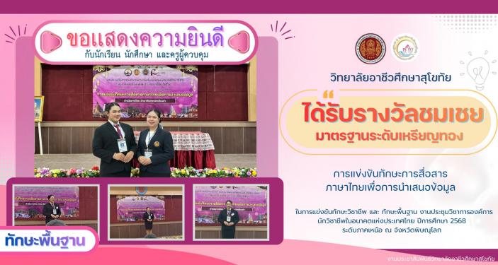 🎉🎉วิทยาลัยอาชีวศึกษาสุโขทัย 🎉🎉 ขอแสดงความยินดี กับนักเรียน นักศึกษา และครูผู้ควบคุมแผนกวิชาการจัดการสำนักงานดิจิทัล #ได้รับรางวัลชมเชยมาตรฐานเหรียญทอง ทักษะวิชาชีพ ทักษะการประยุกต์ใช้เทคโนโลยีดิจิทัลในการพิมพ์ ระดับ ปวช. ประเภท เดี่ยว ในการแข่งขันทักษะวิชาชีพ และ ทักษะพื้นฐาน งานประชุมวิชาการองค์การนักวิชาชีพในอนาคตแห่งประเทศไทย ปีการศึกษา 2568 ระดับภาคเหนือ ณ จังหวัดพิษณุโลก นักเรียนผู้เข้าร่วมการแข่งขัน นายชินดนัย เสมานารถ ครูผู้ควบคุม นางสาวอุษณีย์ เกษร