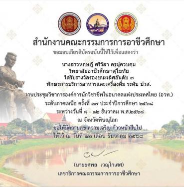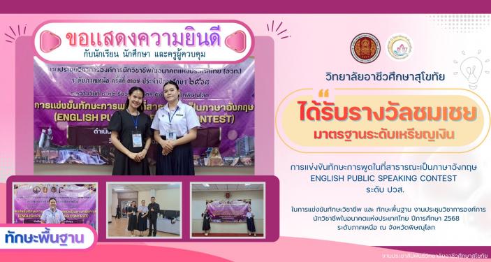 🎉🎉วิทยาลัยอาชีวศึกษาสุโขทัย 🎉🎉 ขอแสดงความยินดี กับนักเรียน นักศึกษา และครูผู้ควบคุม #ได้รับรางวัลชมเชยมาตรฐานระดับเหรียญเงิน ทักษะพื้นฐาน การแข่งขันทักษะการพูดในที่สาธารณะเป็นภาษาอังกฤษ English Public Speaking Contest ระดับ ปวส. ในการแข่งขันทักษะวิชาชีพ และ ทักษะพื้นฐาน งานประชุมวิชาการองค์การนักวิชาชีพในอนาคตแห่งประเทศไทย ปีการศึกษา 2568 ระดับภาคเหนือ ณ จังหวัดพิษณุโลก นักเรียนผู้เข้าร่วมการแข่งขัน นางสาวรณิดา พรหมจอม ครูผู้ควบคุม ครูธนัญญา กันทะสุข