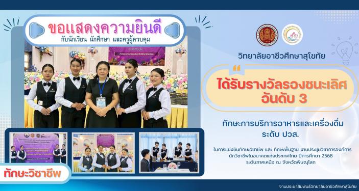 🎉🎉วิทยาลัยอาชีวศึกษาสุโขทัย 🎉🎉 ขอแสดงความยินดี กับนักเรียน นักศึกษา และครูผู้ควบคุมแผนกวิชาการโรงแรมเเละการท่องเที่ยว #ได้รับรางวัลรองชนะเลิศอันดับ3 ทักษะวิชาชีพ ทักษะการบริการอาหารและเครื่องดื่ม ระดับ ปวส. ในการแข่งขันทักษะวิชาชีพ และ ทักษะพื้นฐาน งานประชุมวิชาการองค์การนักวิชาชีพในอนาคตแห่งประเทศไทย ปีการศึกษา 2568 ระดับภาคเหนือ ณ จังหวัดพิษณุโลก นักเรียนผู้เข้าร่วมการแข่งขัน นางสาวณัชชา สุวรรณวงษ์ นางสาวปัณชญา ท้วมเลิศ นางสาวจรรยพร นวลทิม นางสาวิภาพร อินทร์เรือง ครูผู้ควบคุม นางสาวหฤษฎี ศรีวิลา