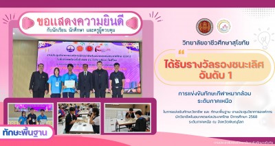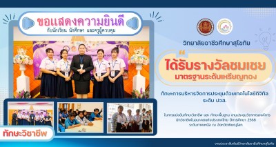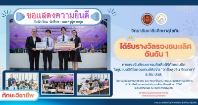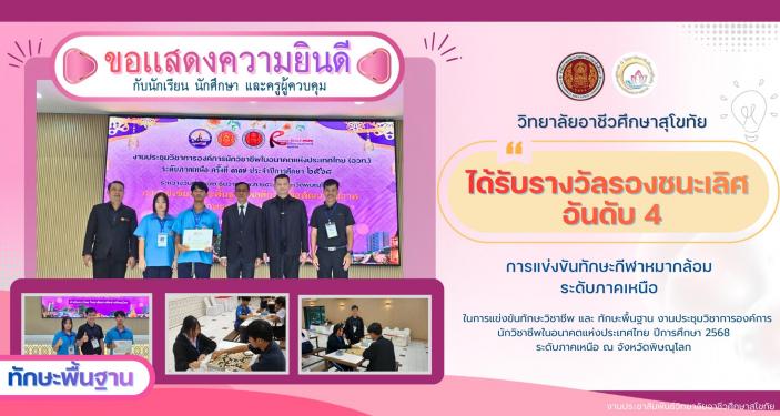 วิทยาลัยอาชีวศึกษาสุโขทัย ขอแสดงความยินดีกับแผนกวิชาคหกรรมศาสตร์ การแข่งขันทักษะวิชาชีพด้านคหกรรมศาสตร์ การแข่งขันเเกะสลักผักเครื่องจิ้มพร้อมภาชนะใบตอง ชิงถ้วยพระราชทาน สมเด็จพระกนิษฐาธิราชเจ้ากรมสมเด็จพระเทพ รัตน์รัตนราชสุดาสยามมงกุฎราชกุมารี ประจำปีการศึกษา 2568 เมื่อวันที่ 19 ธันวาคม 2568 ณ คณะเทคโนโลยีคหกรรมศาสตร์ มหาวิทยาลัยเทคโนโลยีราชมงคลพระนคร กรุงเทพมหานคร ได้รับรางวัลรองชนะเลิศ อันดับ 2 ระดับประกาศนียบัตรวิชาชีพ ปวช. ผู้เข้าแข่งขัน 1. นายธนพนธ์ มาเร็ว นักศึกษา ระดับ ปวช.2 แผนกวิชาคหกรรมศาสตร์ 2. นางสาวนันทิกานต์ ไกรกลิ่น นักศึกษา ระดับ ปวช.2 แผนกวิชาคหกรรมศาสตร์ 3. นางสาวขวัญนภา ใจดี นักศึกษา ระดับ ปวช.2 แผนกวิชาคหกรรมศาสตร์ 4. นางสาววันนิษา เพียราษฎร์ นักศึกษา ระดับ ปวช.1 แผนกวิชาคหกรรมศาสตร์ 5. นางสาวสุธาสินี คันธนา นักศึกษา ระดับ ปวช.1 แผนกวิชาคหกรรมศาสตร์ ครูผู้ควบคุม 1. นางวนิดา ไกรกิจราษฎร์ หัวหน้าแผนกวิชาคหกรรมศาสตร์ 2. นางกนกวรรณ สวนใต้ ครูแผนกวิชาคหกรรมศาสตร์ 3. นายธนพนธ์ บุตรพรม ครูแผนกวิชาคหกรรมศาสตร์