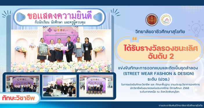 🎉🎉วิทยาลัยอาชีวศึกษาสุโขทัย 🎉🎉 ขอแสดงความยินดี กับนักเรียน นักศึกษา และครูผู้ควบคุมแผนกวิชาเเฟชั่นเเละสิ่งทอ #ได้รับรางวัลรองชนะเลิศอันดับ2 ทักษะวิชาชีพ ทักษะวิชาชีพทักษะ การแข่งขันทักษะวิชาชีพ ทักษะการออกแบบและตัด เย็บชุดลำลอง (Street Wear Fashion & Design) ระดับ (ปวช.) ในการแข่งขันทักษะวิชาชีพ และ ทักษะพื้นฐาน งานประชุมวิชาการองค์การนักวิชาชีพในอนา....