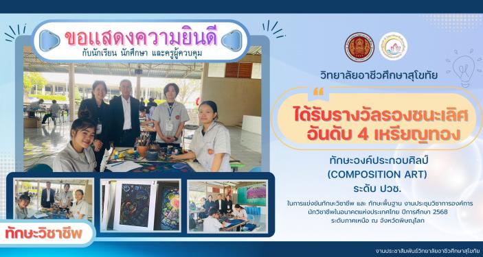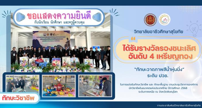 🎉🎉วิทยาลัยอาชีวศึกษาสุโขทัย 🎉🎉 ขอแสดงความยินดี กับนักเรียน นักศึกษา และครูผู้ควบคุมแผนกวิชาวิจิตรศิลป์ #ได้รับรางวัลรองชนะเลิศอันดับ4เหรียญทอง ทักษะวิชาชีพ ทักษะองค์ประกอบศิลป์ ระดับ ปวช. ในการแข่งขันทักษะวิชาชีพ และ ทักษะพื้นฐาน งานประชุมวิชาการองค์การนักวิชาชีพในอนาคตแห่งประเทศไทย ปีการศึกษา 2568 ระดับภาคเหนือ ณ จังหวัดพิษณุโลก นักเรียนผู้เข้....