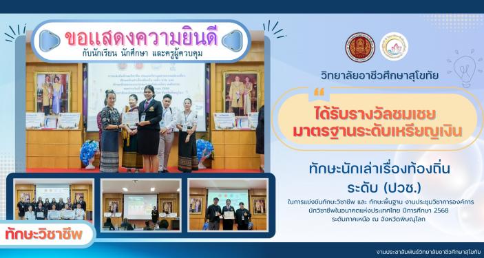 🎉🎉วิทยาลัยอาชีวศึกษาสุโขทัย 🎉🎉 ขอแสดงความยินดี กับนักเรียน นักศึกษา และครูผู้ควบคุมแผนกวิชาการโรงแรมเเละการท่องเที่ยว #ได้รับรางวัลชมเชยมาตรฐานระดับเหรียญเงิน ทักษะวิชาชีพ ทักษะนักเล่าเรื่องท้องถิ่น ระดับ ปวช ในการแข่งขันทักษะวิชาชีพ และ ทักษะพื้นฐาน งานประชุมวิชาการองค์การนักวิชาชีพในอนาคตแห่งประเทศไทย ปีการศึกษา 2568 ระดับภาคเหนือ ณ จังหวัดพิษณุโลก ....