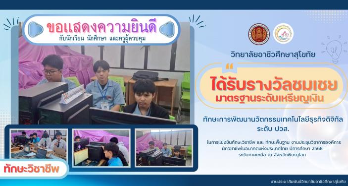 🎉🎉วิทยาลัยอาชีวศึกษาสุโขทัย 🎉🎉 ขอแสดงความยินดี กับนักเรียน นักศึกษา และครูผู้ควบคุมแผนกวิชาสาขาวิชาเทคโนโลยีธุรกิจดิจิทัล #ได้รับรางวัลชมเชยมาตรฐานเหรียญเงิน ทักษะวิชาชีพ ทักษะการพัฒนานวัตกรรมเทคโนโลยีธุรกิจดิจิทัล ระดับประกาศนียบัตรวิชาชีพชั้นสูง (ปวส.) ในการแข่งขันทักษะวิชาชีพ และ ทักษะพื้นฐาน งานประชุมวิชาการองค์การนักวิชาชีพในอนาคตแห่งประเทศไทย ปีก....