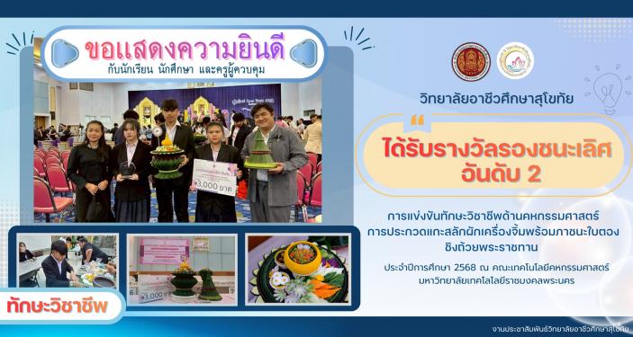 วิทยาลัยอาชีวศึกษาสุโขทัย ขอแสดงความยินดีกับแผนกวิชาคหกรรมศาสตร์ การแข่งขันทักษะวิชาชีพด้านคหกรรมศาสตร์ การแข่งขันเเกะสลักผักเครื่องจิ้มพร้อมภาชนะใบตอง ชิงถ้วยพระราชทาน สมเด็จพระกนิษฐาธิราชเจ้ากรมสมเด็จพระเทพ รัตน์รัตนราชสุดาสยามมงกุฎราชกุมารี ประจำปีการศึกษา 2568 เมื่อวันที่ 19 ธันวาคม 2568 ณ คณะเทคโนโลยีคหกรรมศาสตร์ มหาวิทยาลัยเทคโนโลยีราชมงคลพระนคร กรุงเทพมหานคร ได้ร....