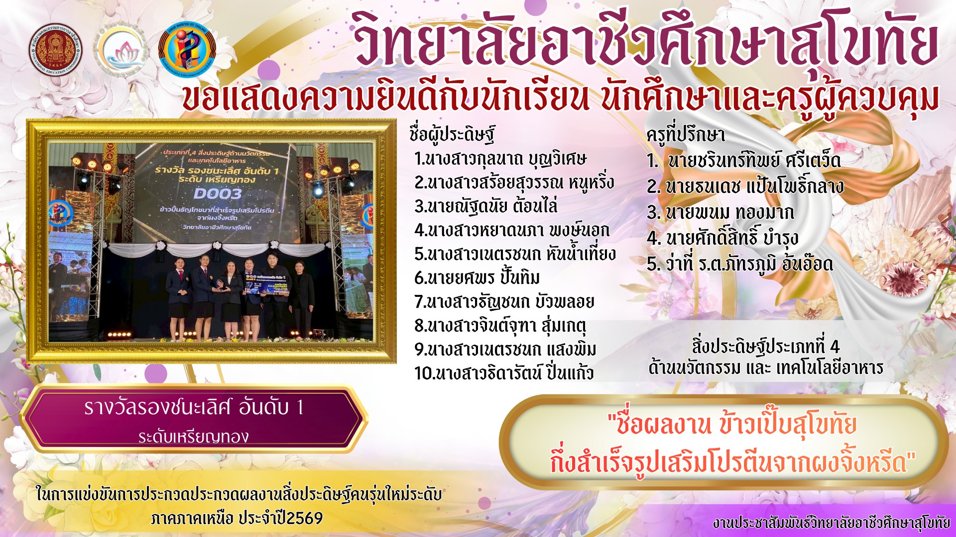 วิทยาลัยอาชีวศึกษาสุโขทัย ขอแสดงความยินดี กับนักเรียน นักศึกษา และครูที่ปรึกษาผลงานสิ่งประดิษฐ์คนรุ่