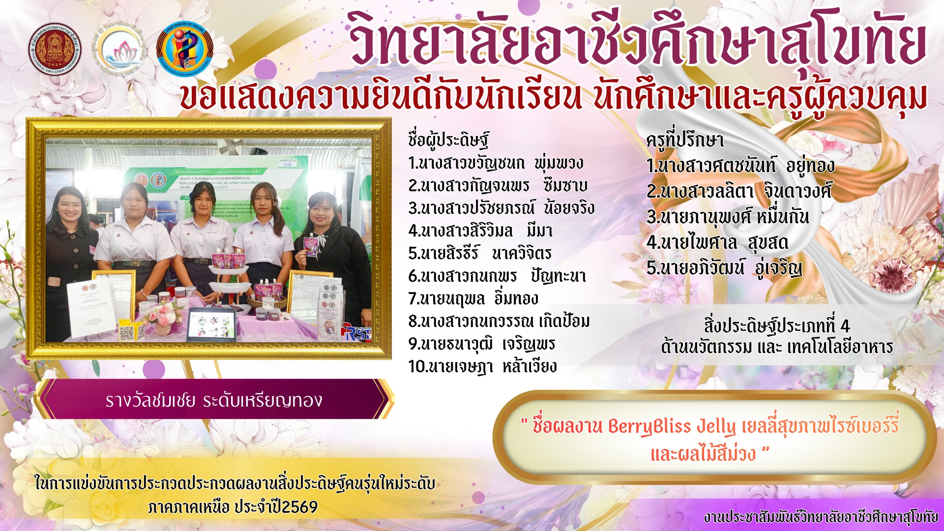 วิทยาลัยอาชีวศึกษาสุโขทัย โดย นายมารุต รื่นรวย ผู้อำนวยการวิทยาลัยอาชีวศึกษาสุโขทัย และ นางสาวศตชนันท์ อยู่ทอง หัวหน้าวิจัยนวัตกรรมและสิ่งประดิษฐ์นำครูที่ปรึกษาและนักเรียนเข้าร่วมประกวดผลงานสิ่งประดิษฐ์คนรุ่นใหม่ระดับภาค ภาคเหนือ ประจำปี 2568 จำนวน 4 ผลงาน จัดขึ้นระหว่างวันที่ 12 14 มกราคม 2569 ณ วิทยาลัยเทคนิคลำปาง จ.ลำปาง